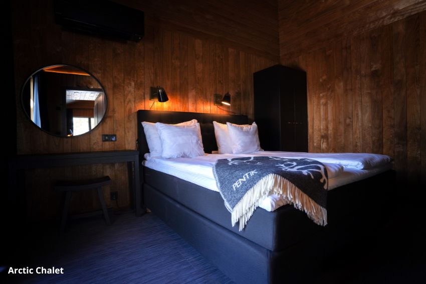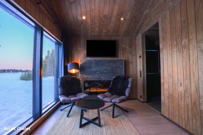 Wil je wat meer luxe? Upgrade je verblijf naar een Arctic chalet. De hoogwaardige 2-onder-1 kap chalets zijn ingericht met Fins design en een vleugje arctische luxe. De chalet heeft een slaapkamer met een kingsize bed en vanuit de slaapkamer bereik je de badkamer met douche en privésauna. De woonkamer heeft een open haard om aan het eind van de dag lekker op te warmen. Via de grote panoramische ramen kijk je uit richting het Inarimeer. Let op: niet alle chalets hebben direct zicht op het meer.