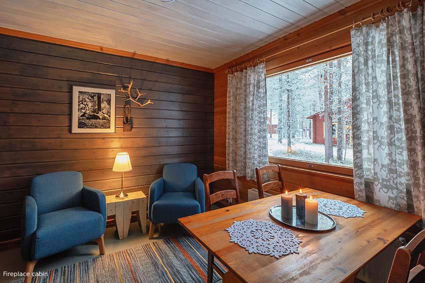De cabins hebben twee aparte slaapkamers, een kamer met twee eenpersoonsbedden en een kamer met een klein tweepersoonsbed (1,20m breed). Daarnaast is er ook een leefgedeelte met een zitje en open haard. Verder is er een kitchenette en badkamer met douche en toilet.