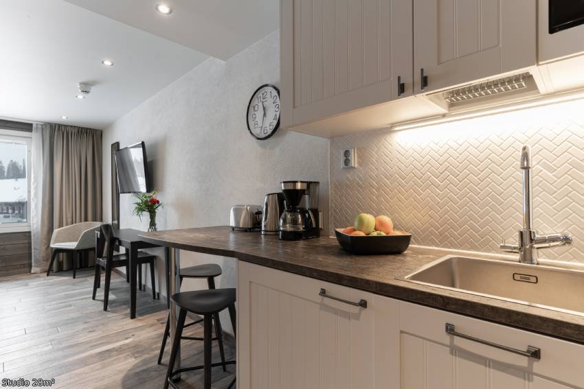 De familie studio's zijn 32m2 en bieden ruimte voor 4 personen ( 2 volwassenen en 2 kinderen). De woon-/slaapkamer is efficiënt en comfortabel ingericht met 2 bedden, een zithoek met bank en tv en een open keuken. Op de open vide 2 slaapplaatsen voor kinderen. De keuken is volledig ingericht met koelkast, elektrische kookplaat, oven, magnetron, vaatwasser, broodrooster en koffiezetapparaat. De centrale bar met spoeleiland dient als eettafel met 4 zitplaatsen. De badkamer is voorzien van douche en toilet en er is een privésauna. Ook hier een droogkast en gratis wifi. Deze appartementen beschikken over een balkon of terras met eigen skilocker. Ontbijt niet inbegrepen.